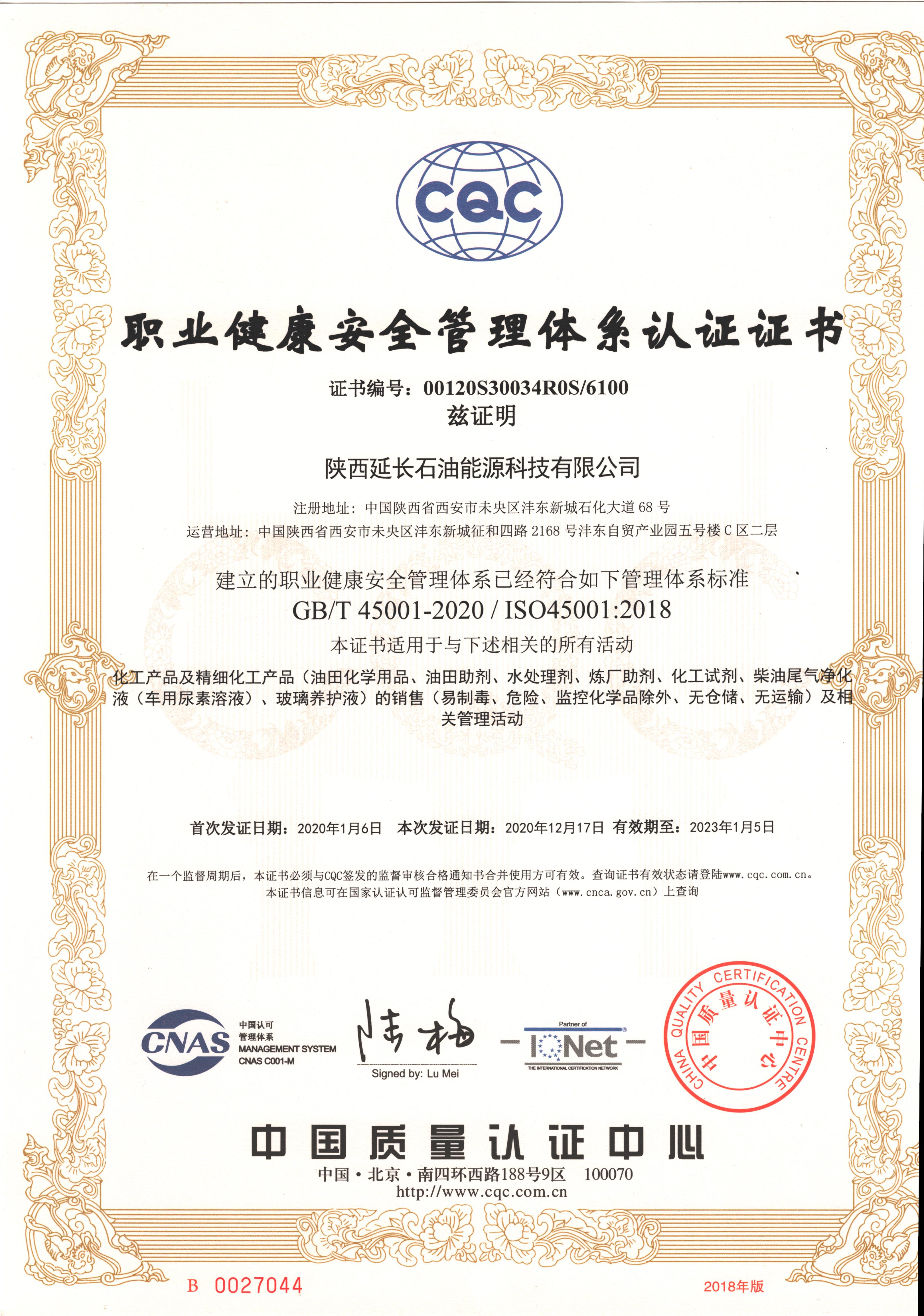 职业健康安全管理体系认证证书