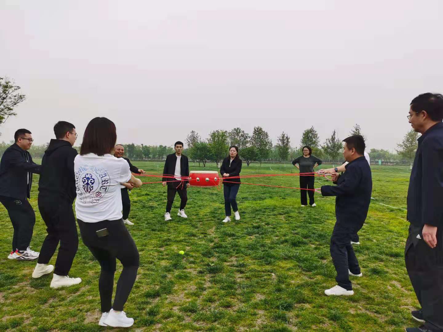 首先进行的是工间操比赛,业务部、财务资产部、科技部、综合办公室四个部门依次上场,乐曲响起时,每个人都是信心满满,经过六位评委打分过后,财务部获得了优秀奖,由吴总颁发了奖杯。接下来在公园草坪上进行了四项趣味拓展活动,主要是为了增强团队协作和凝聚力,活动中各部门按照活动规则通过竞技决定胜负。活动中队员们相互沟通交流,不再拘束,密切协作,在消耗大量体力的同时也彻底点燃了激情。活动中不仅增进了员工之间的亲近感,也考验了队员之间的配合、协调能力。最后,吴总和王总分别作了讲话,在欢声笑语中,拓展活动画上了圆满句号。